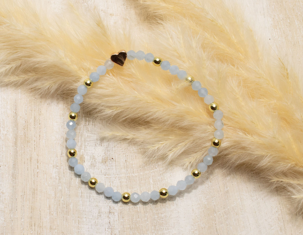 Traumhaft schönes Armband aus Aquamarin Naturstein Perlen mit 18K vergoldeten Perlen und Herzchen.