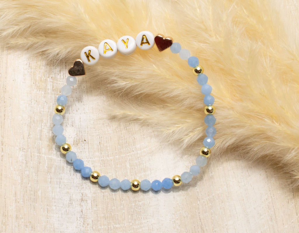 Aquamarin Armband, Personalisiert , 18K vergoldete Perlen, Namensarmband