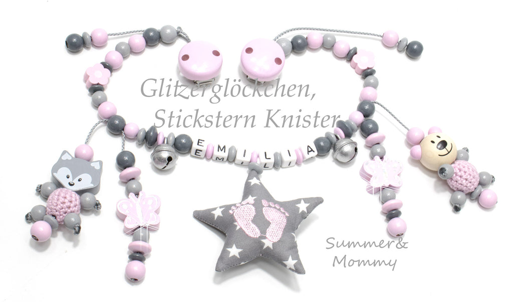 Kinderwagenkette Fuchs Teddy in rosa-grau mit Wunschnamen